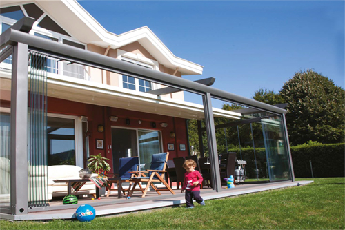 Vertically sliding motorized sashes with tow or three panels from floor to ceiling offers great visibility and convenience. While the panels are retracted down, the system act as a glass railing.By push of a button the panels retract open all the way to ceiling insulation your space with suitable glazed and tampered glass.